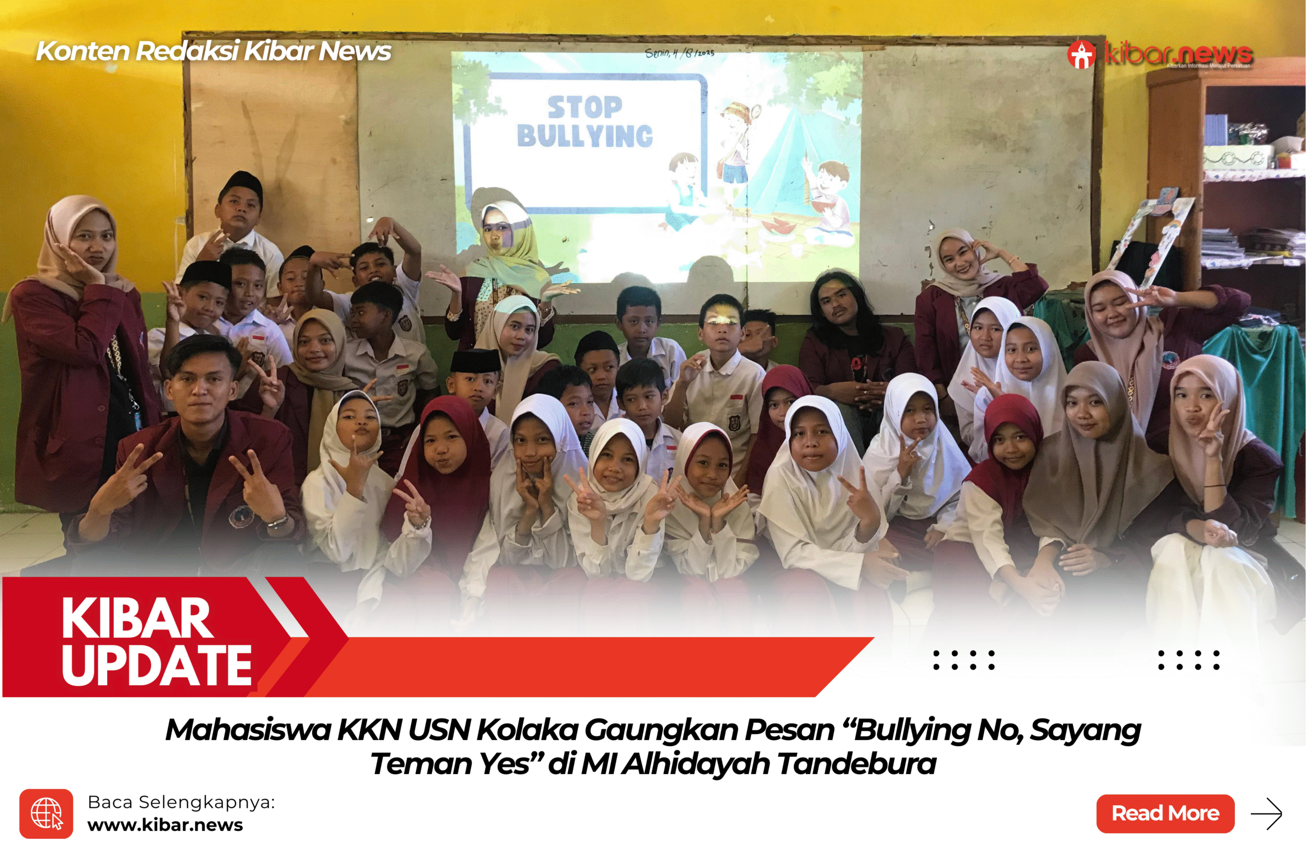 Kibar News, Bombana – Suasana berbeda tampak di MI Alhidayah Tandebura pada Selasa (5/8/2025). Sejak pagi, tawa dan semangat memenuhi ruang kelas ketika mahasiswa Kuliah Kerja Nyata (KKN) Universitas Sembilanbelas November (USN) Kolaka hadir untuk menggelar sosialisasi bertajuk Stop Bullying.