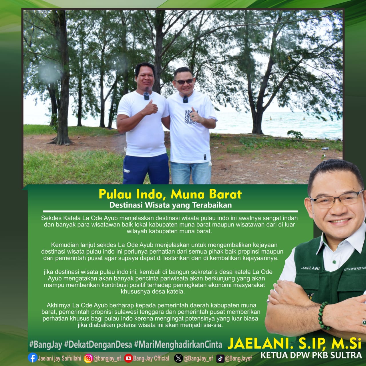 “Bantuan dan perhatian dari pemerintah kabupaten, pemerintah provinsi dan pemerintah pusat sangat kami harapkan, alhamdulillah melalui bapak jaelani, kami bisa berharap bantuannya sehingga bangunan dan fasilitas yang sudah tidak layak semua akan di benahi sehingga menjadi cantik kembali destinasi wisata pulau indo ini, karena dulu ini bagus sekali semua masyarakat datang berkunjung dan tingkat perekonomian masyarakat juga meningkat, ” tutupnya