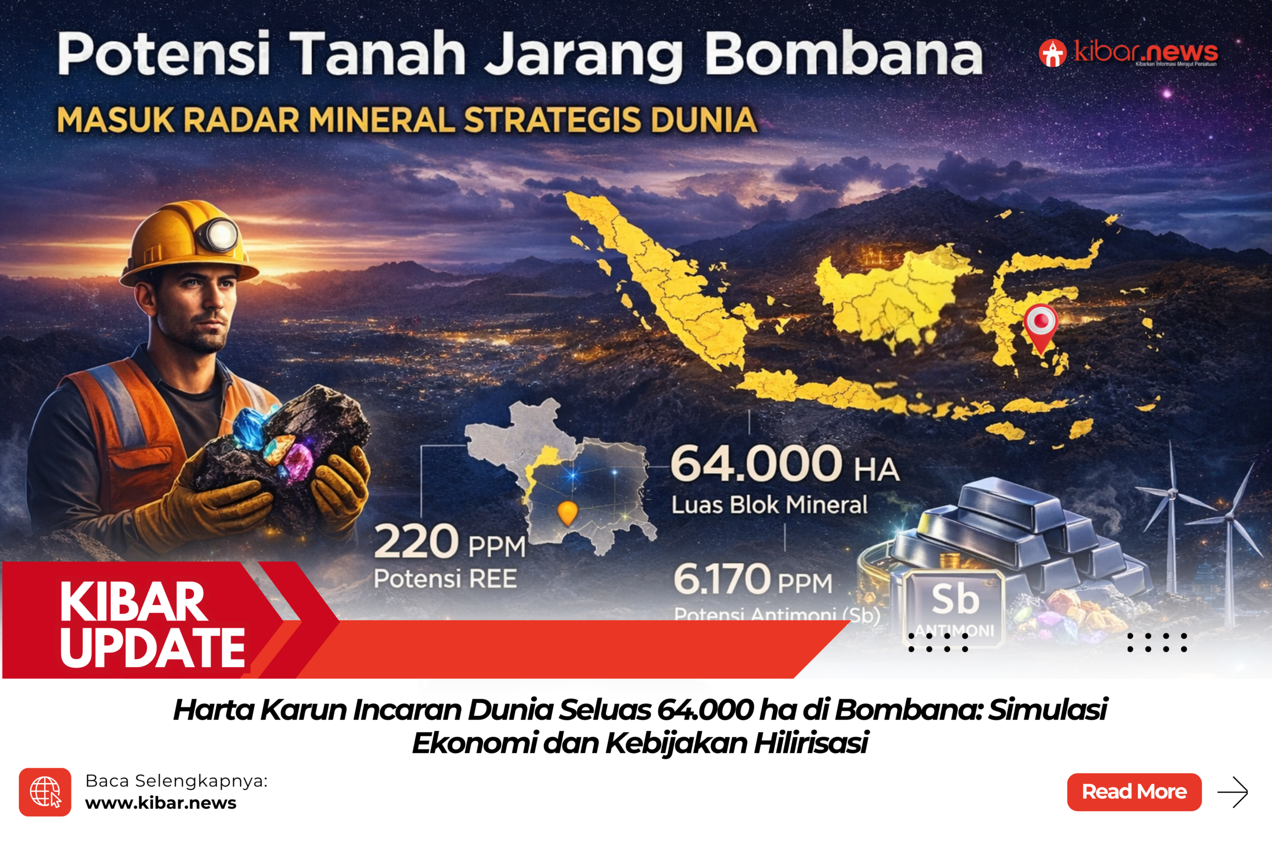 Kibar News, Bombana — Kabupaten Bombana kembali mencuri perhatian nasional sebagai salah satu lokasi dengan potensi mineral strategis rare earth elements (REE) atau logam tanah jarang. Data pemetaan nasional yang dirilis Badan Industri Mineral (BIM) menunjukkan Blok Bombana memiliki area seluas ±64.000 hektare dengan kandungan REE sekitar 220 ppm serta antimony 6.170 ppm, menjadikannya blok mineral tanah jarang terbesar di Indonesia berdasarkan luas konsesi dibanding sejumlah blok lain di Kalimantan dan Bangka Belitung.