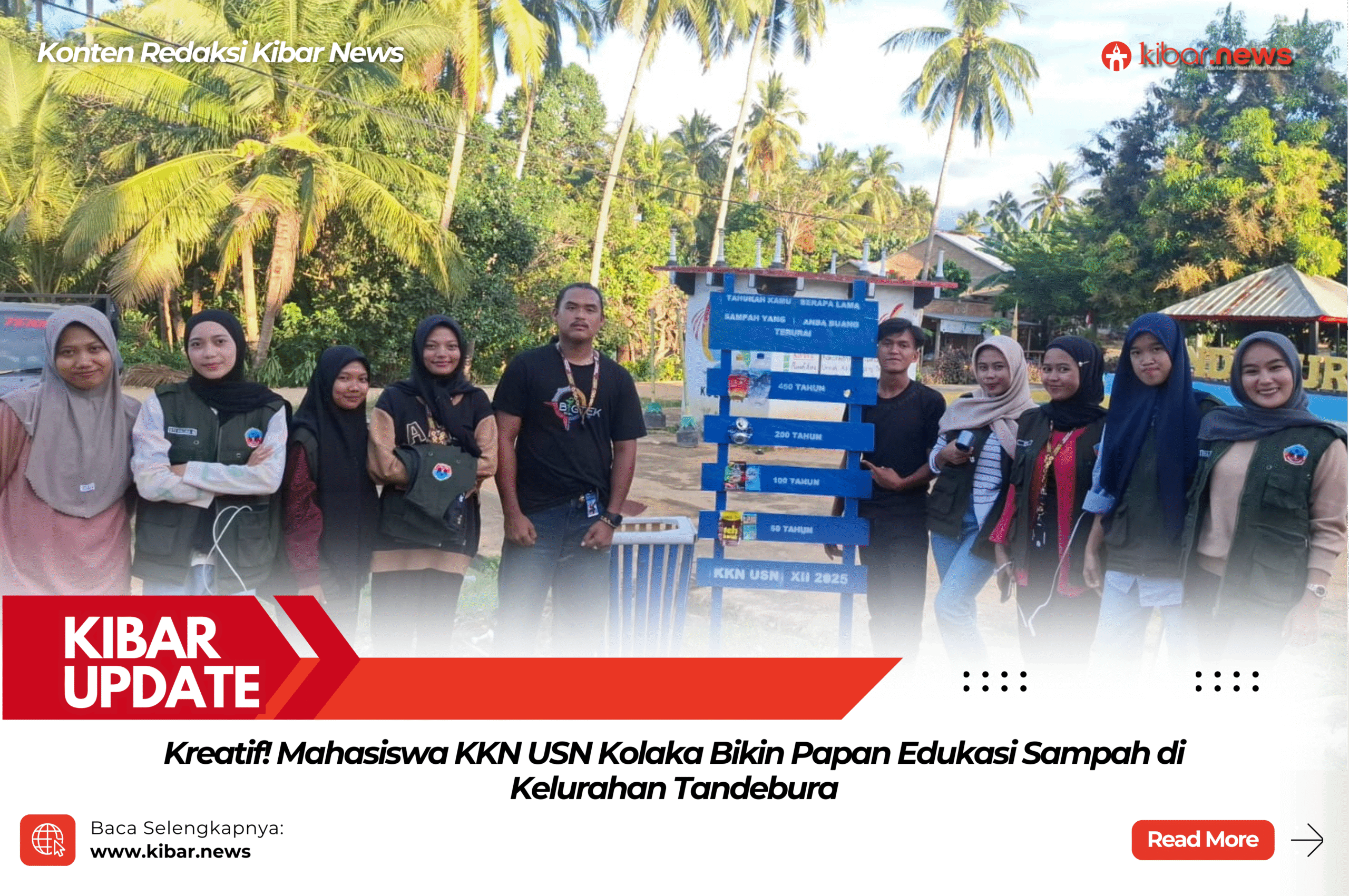 Kibar News, Bombana Mahasiswa Kuliah Kerja Nyata (KKN) Universitas Sembilanbelas November (USN) Kolaka yang bertugas di Kelurahan Tandebura, Kecamatan Watubangga, menghadirkan inovasi unik berupa papan edukasi lama sampah terurai, Rabu, (13/08/2025).
