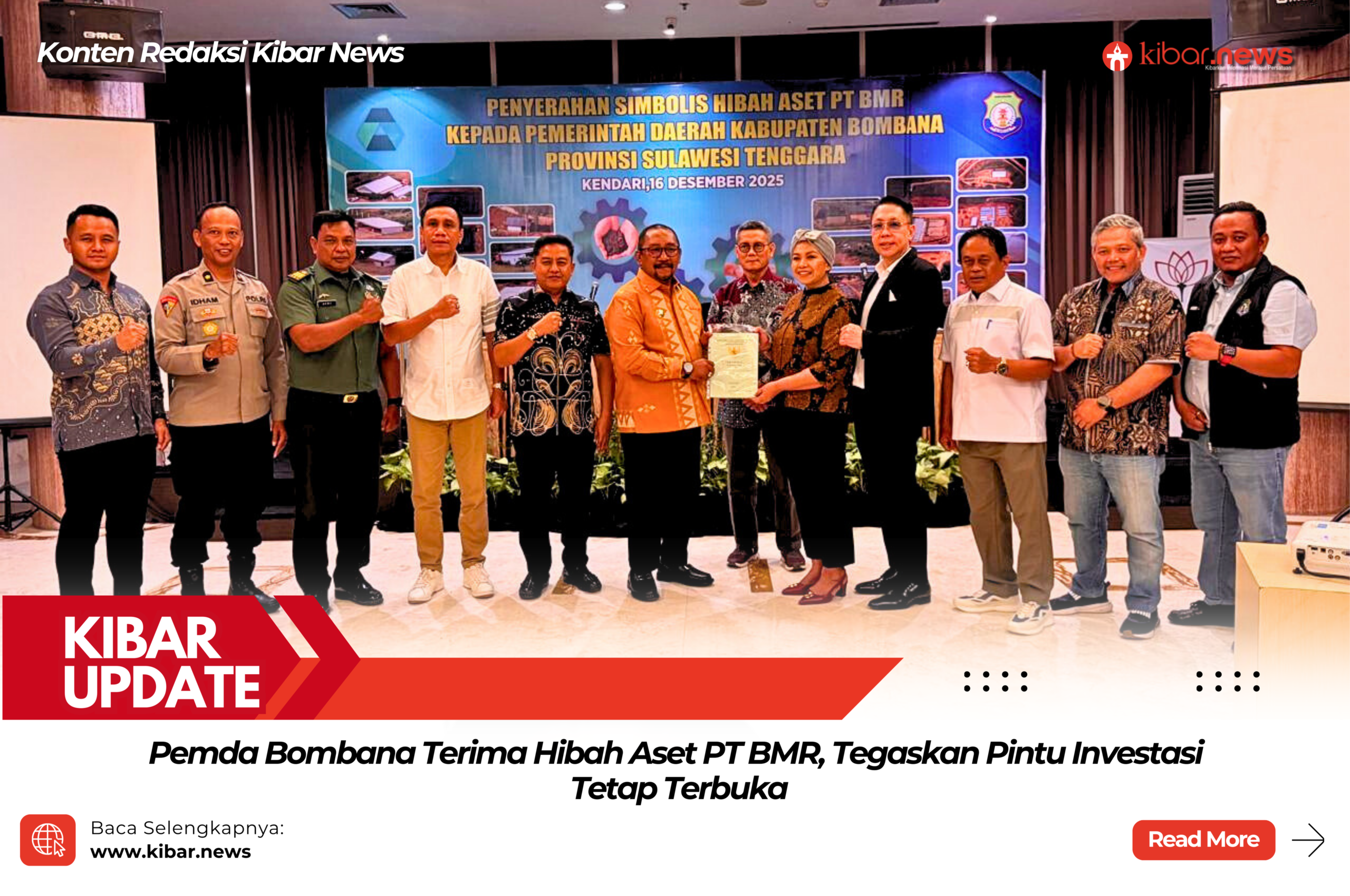 Kibar News, Kendari — Pemerintah Kabupaten Bombana resmi menerima hibah aset dari PT Bukit Makmur Resources (BMR) dalam sebuah seremoni yang digelar di Hotel Claro Kendari, Selasa malam (16/12/2025).