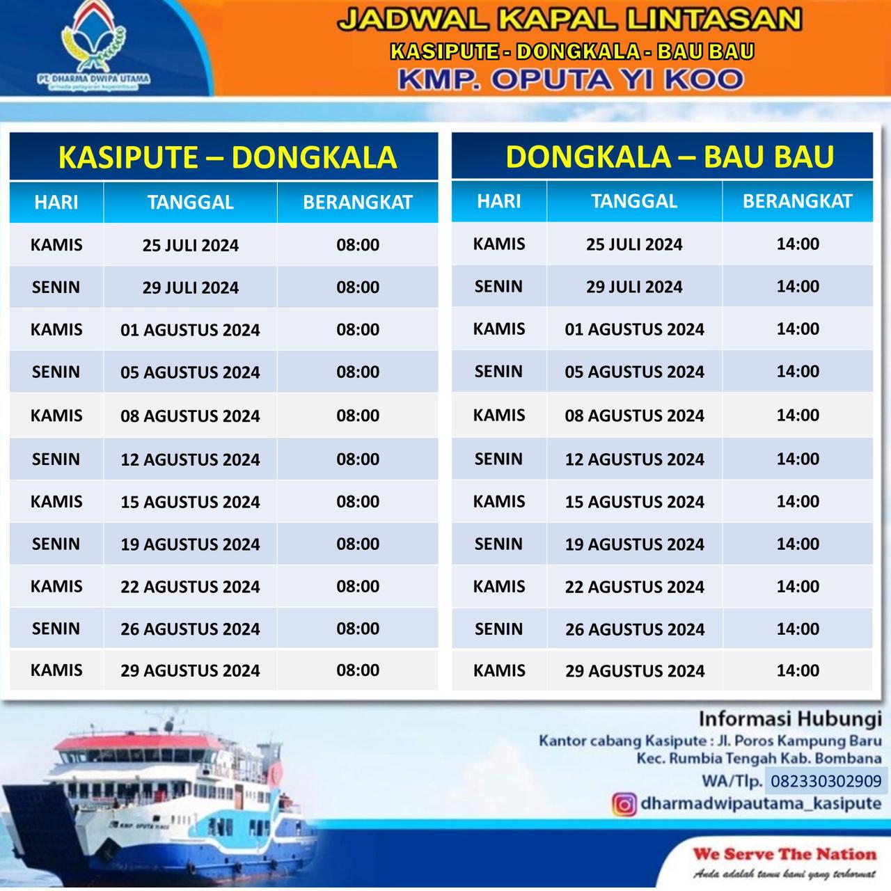 Adapun pamflet flayer jadwal yang telah beredar di berbagai medsos itu, rencananya KMP Oputa Yi Koo bakal beroperasi dua kali dalam seminggu yakni hari Senin dan Kamis dari Pelabuhan Kasipute menuju Pelabuhan Bau-bau dan sebaliknya Selasa – Jumat dari Bau-bau – Dongkala – Kasipute.